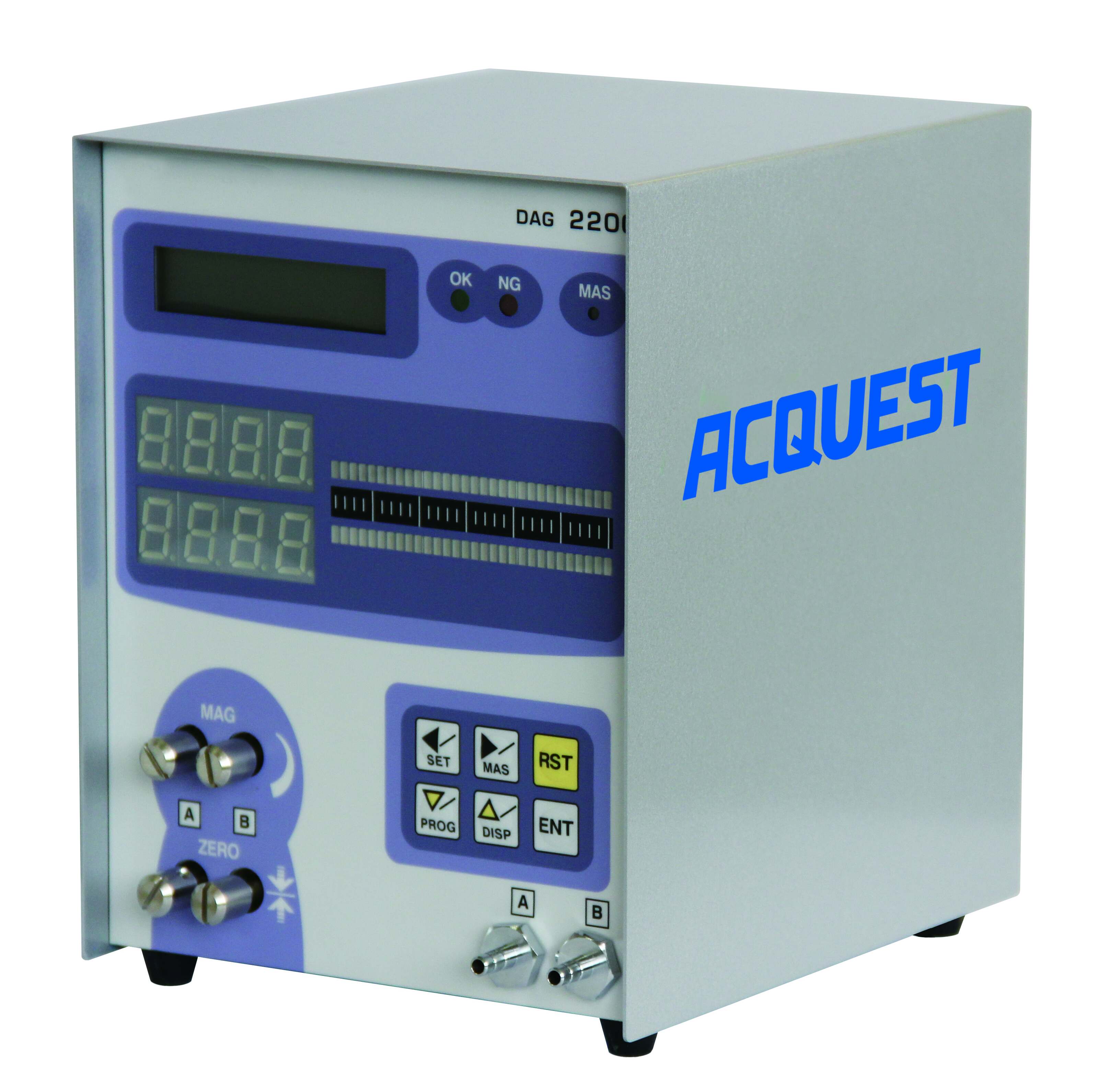 The DAG-2200 Gauge display with separate, customized air probe sensors performs fast, easy and precise, dimensional analysis on components. The DAG-2200 provides two separate sensor channel inputs with corresponding bar graph indication of an item’s dimension. Pass/Fail feedback is instant with the light color LED indication of go/no go (OK, NG).